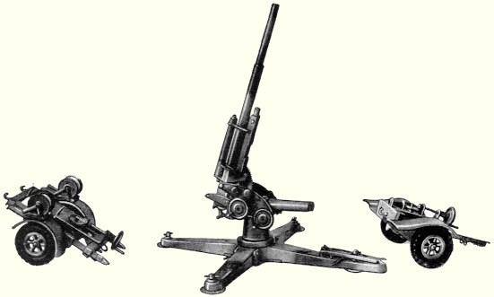 mit einen aufwendigen Spindelmechanismus zur Befestigung der Vorder-,und Hinterwagen geliefert.Dieser wurde ab 1939 durch einen einfachen Schiebemechanismus abgelöst.Die Flak konnte durch Stellräder in der Höhe und der Seite verstellt werden.Außerdem konnte man natürlich auch Amorces/Zündplättchen verschiessen.Die Flak wurde im grauen Karton verkauft und kostete RM 8,25.